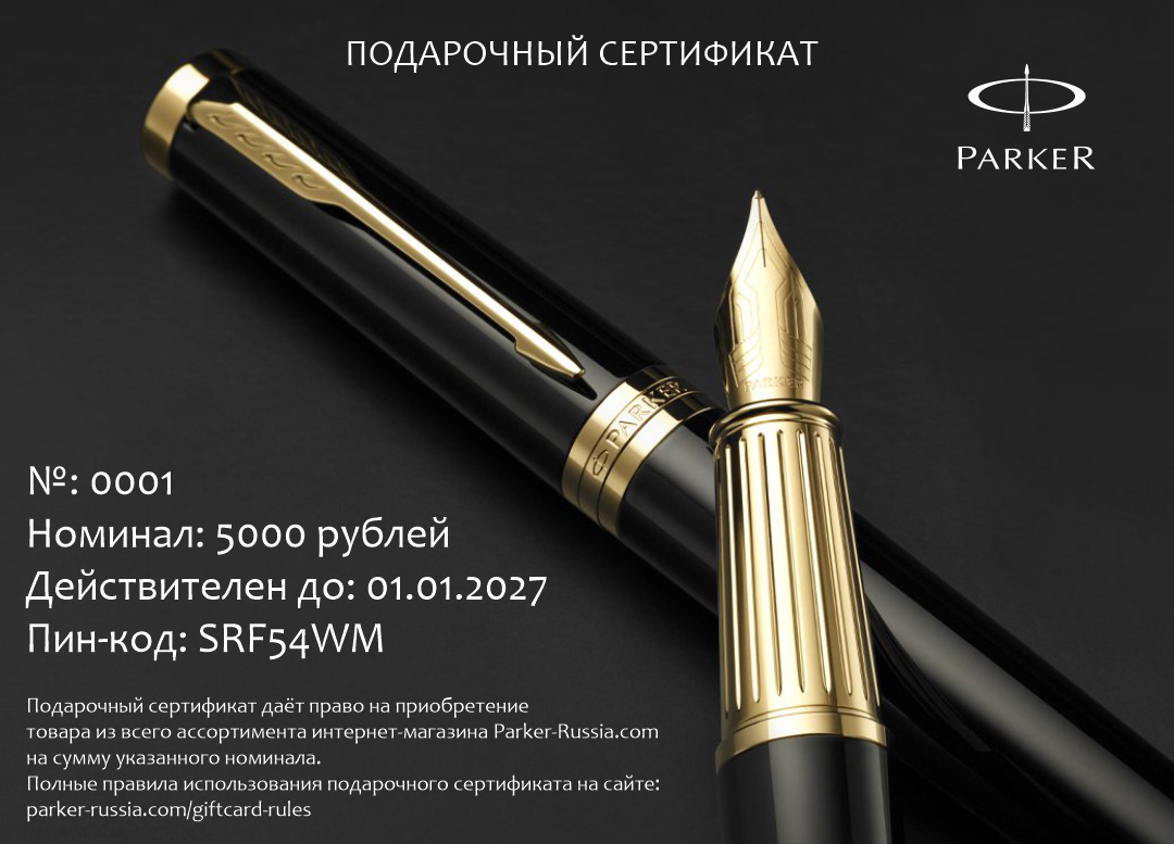 Подарочный сертификат Parker 10000 от официального дилера Parker во Владивостоке. Вы можете дополнительно заказать гравировку, которая подчеркнет Вашу оригинальность и придаст памятность статусному подарку. Все ручки Паркер поставляются в фирменном футляре.
